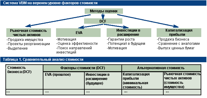 Итак, для целей управления стоимостью компании может использоваться несколько методов оценки и, соответственно, несколько показателей стоимости. Эти показатели не подлежат интегрированию – они анализируются отдельно, сравниваются друг с другом и служат для принятия различных управленческих решений.